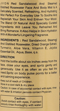 JVON red sandalwood and steamed distilled pose water face and body mist is a delicately scented, refreshing, and hydrating mist perfect for everyday use to soothe and replenish your skin and enliven your mood. The blend of natural and specially curated ingredients will leave you refreshed and bring romance. It also helps in skin hydration with a wonderful lingering fragrance