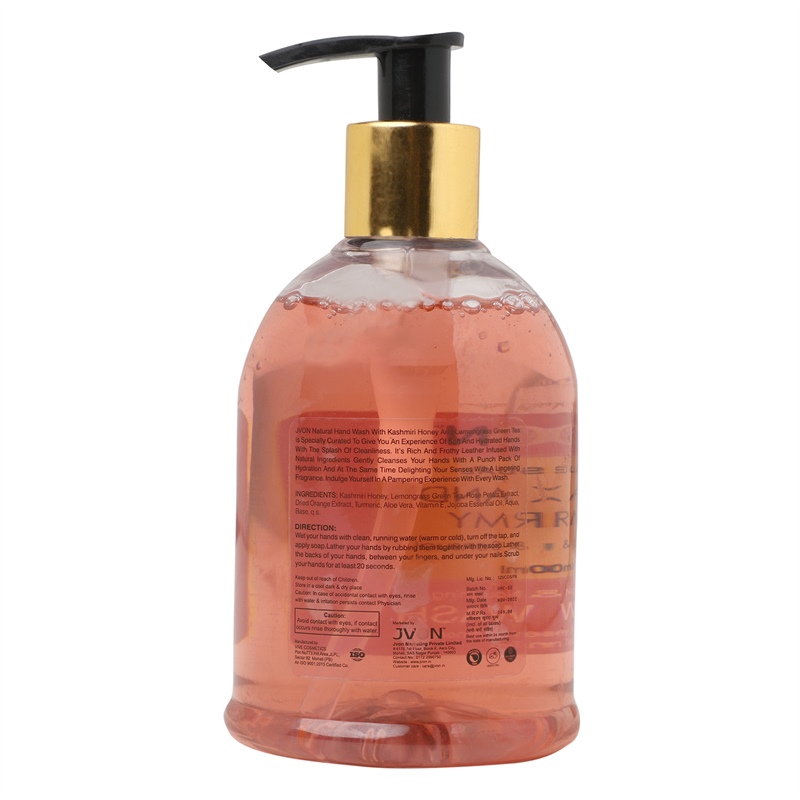 JVON Natural handwash with Kashmiri honey and lemongrass green tea is specially curated to give you an experience of soft and hydrated hands with splash of cleanliness. It’s rich and frothy leather infused with natural ingredients gently cleanses your hands with a punch pack of hydration and at the same time delighting your senses with a lingering fragrance. Indulge yourself in a pampering experience with every wash.